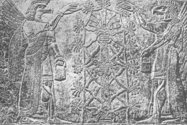 Silnie związana z dobrymi demonami-geniuszmi była ceremonia adoracji drzewa życia. Na reliefach jest to kompozycja heraldyczna: stylizowaną palmę flankują zastygłe w pozie adoracji dwa uskrzydlone geniusze lud kapłani z ptasimi głowami (Fig.8) przebrani za demony. Do grupy o tematyce rytualnej należą jeszcze przedstawienia sceny składania ofiar oraz stelle upamiętniające budowę lub przebudowę świątyń. Jedynym z swoim rodzaju przedstawieniem tego typu jest stella Aszurbanipala, pokazująca władcę niosącego na głowie kosz zaprawy murarskiej do budowy świątyni (Fig.9).