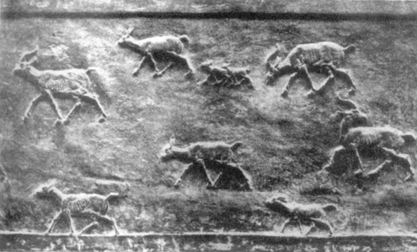 Drugą grupę przedstawień stanowiły reliefy ilustrujące łowy królewskie, w czasie których władca zazwyczaj poluje z rydwanu lub z konia (Fig.5). Poluje na dzikie onegary lub też ptaki. Płaskorzeźby przedstawiają też psiarczyków prowadzących psy specjalnie ćwiczone do polowań oraz same zwierzęta, zwłaszcza lwy w pałacowym ogrodzie , bądź gazele biegnące w rozproszeniu (Fig.6), co wywołuje wrażenie rozległości stepu.