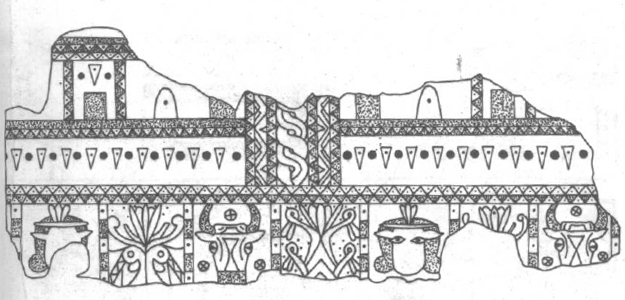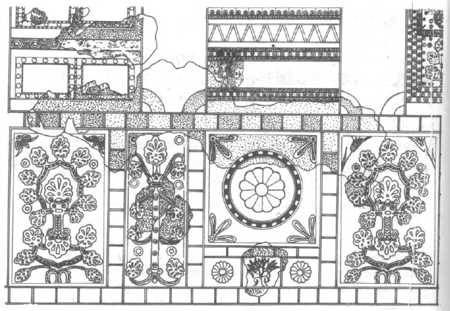 Późniejsze ślady prowadzą do Kartukultininurty, miasta leżącego na północny-wschód od Aszur. W pałacu króla Tukultininurty I (druga połowa XIII wieku p.n.e.) odkryto pełne krasy malarstwo ścienne (Fig.11). Zachowane fragmenty pozwalają zrekonstruować jego wygląd. Płaszczyzny ścian dzielone były na trzy pasy: górny składał się z silnie stylizowanych elementów floralnych i zoomorficznych, środkowy tworzyły rozetki i stylizowane motywy roślinne, a dolny figuralno-ornamentalny pas – prostokątne płyciny, w których umieszczano na przemian sceny adoracji drzewa życia przez kozły i wzorzyście ułożone palmety, tworzące „drzewo palmowe”. Wszystkie pasy rozdzielone były barwnymi szlakami, przypominającymi glazurowaną cegłę.