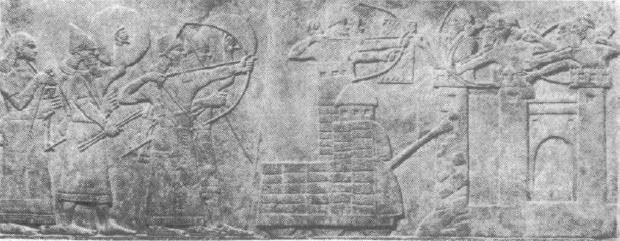 W ciągu IX wieku p.n.e. styl reliefów asyryjskich był surowy, jeszcze nie ukształtowany ostatecznie. Cechowała go statyczność ujęcia, brak hierarchicznego zróżnicowania postaci – król był tego samego wzrostu co żołnierz – nieznajomość zasad perspektywy – żołnierze mają taką samą wysokość jak twierdza (Fig.4). Wolną przestrzeń wypełniano przypadkowymi motywami. Często w ogóle brak krajobrazu, a ziemia zaznaczona jest tylko prostą linią. Zachowały nikłe ślady polichromii.